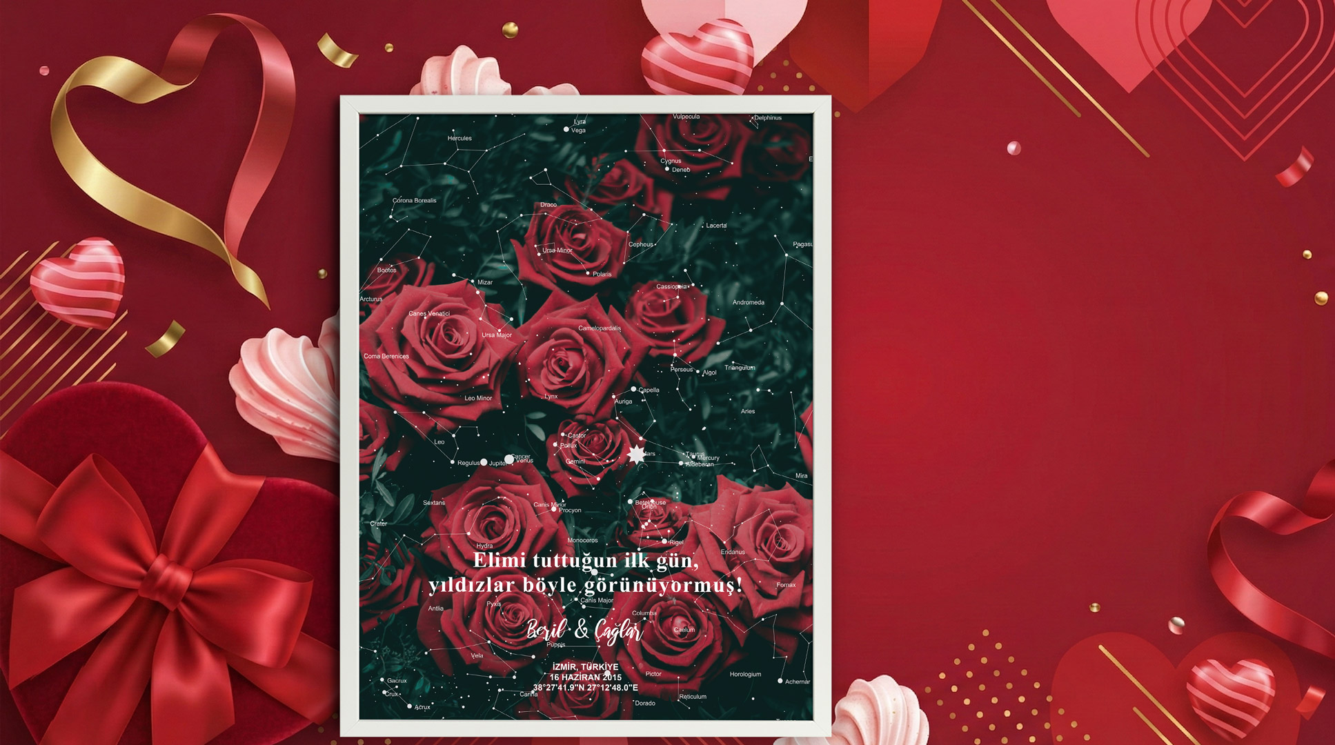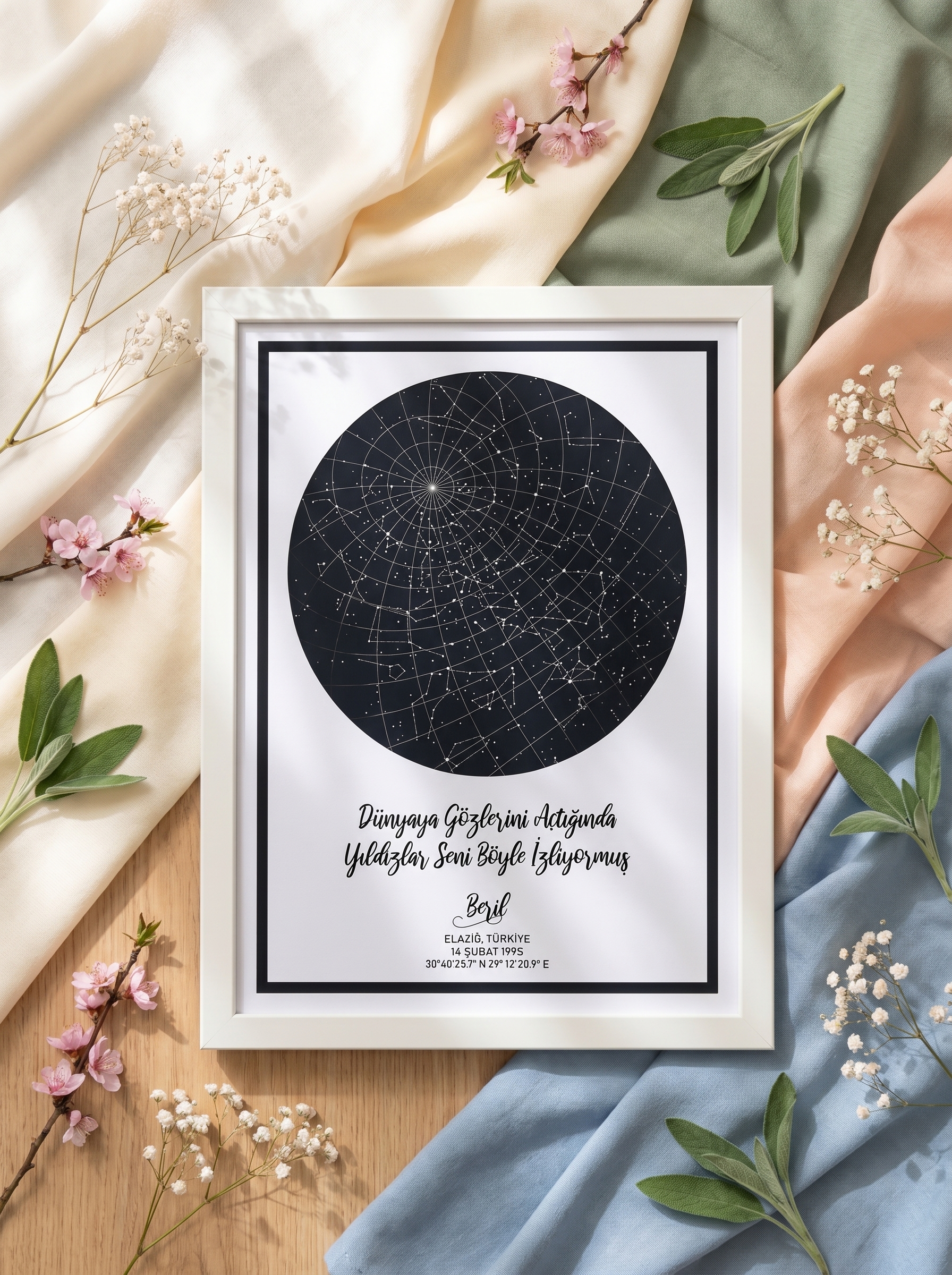 Gökyüzü haritası (yıldız haritası), sizin için anlam taşıyan özel bir tarihte, doğum günü, tanışma anı, evlilik yıl dönümü ya da hayatınızda iz bırakan herhangi bir anda, belirttiğiniz konumda gökyüzünün tam olarak nasıl göründüğünü yansıtan, tamamen kişiye özel bir tasarımdır.