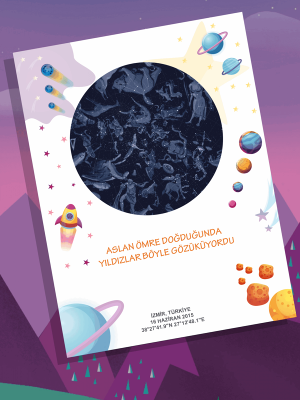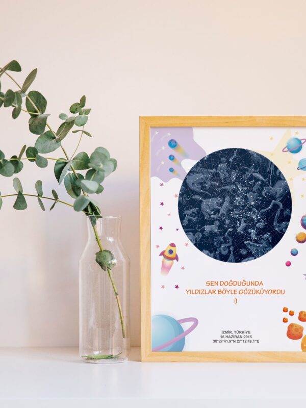Miniklere özel 30×40 cm, Çerçeveli Gökyüzü Haritası !