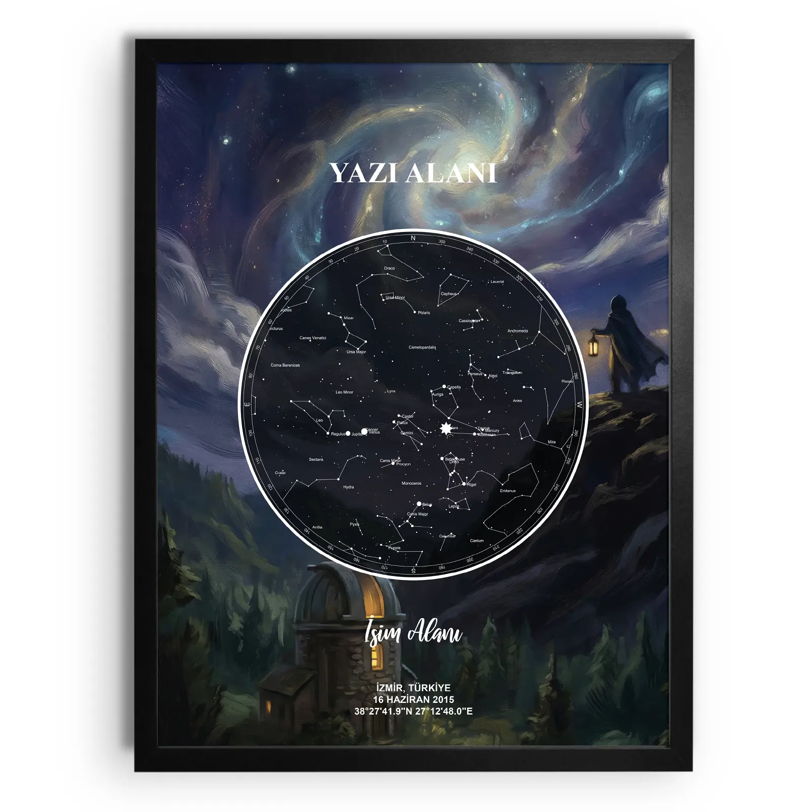In Pursuit of Light çerçeveli gökyüzü haritası tablosu; seçtiğiniz tarih, saat ve konuma göre hazırlanan